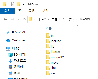 설치 완료되면 C폴더에 MinGW가 설치됨을 확인할 수 있다.