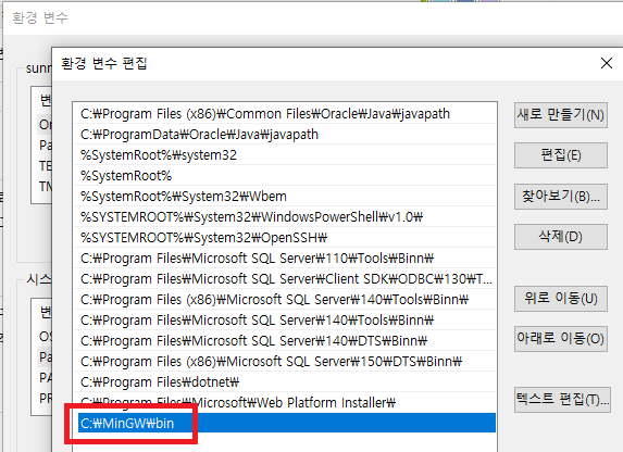 C:\MinGW\bin 을 환경변수로 추가합니다.