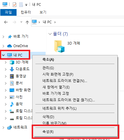 폴더 > 내 PC > 우클릭 > 속성