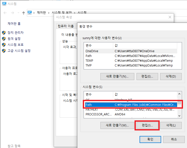 시스템 변수에서 Path 클릭 > 편집 클릭